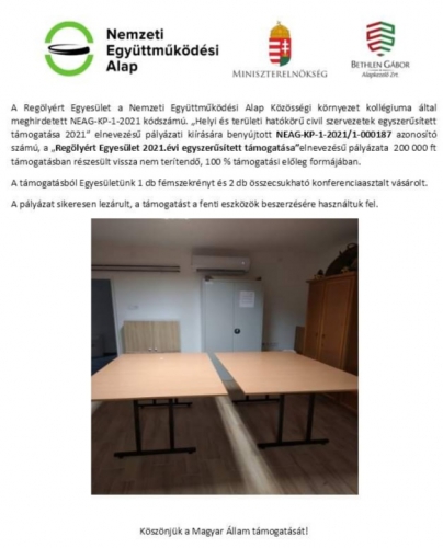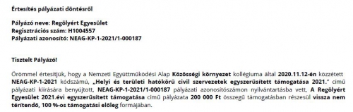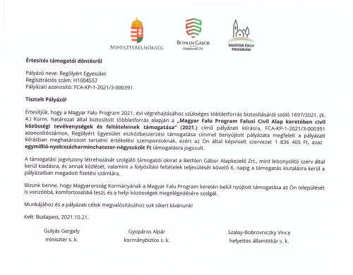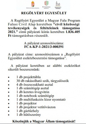 A Regölyért Egyesület a Magyar Falu Program Falusi Civil Alap „civil közösségi tevékenységek és feltételeinek támogatása” (2020.) című pályázati konstrukció keretében, a FCA-KP-1-2020/1-000850 azonosítószámú, „A Regölyért Egyesület klubhelyiségének felújítása” című pályázatával 5 999 292,- Ft támogatást nyert. (A támogatás intenzitása 100 %.)